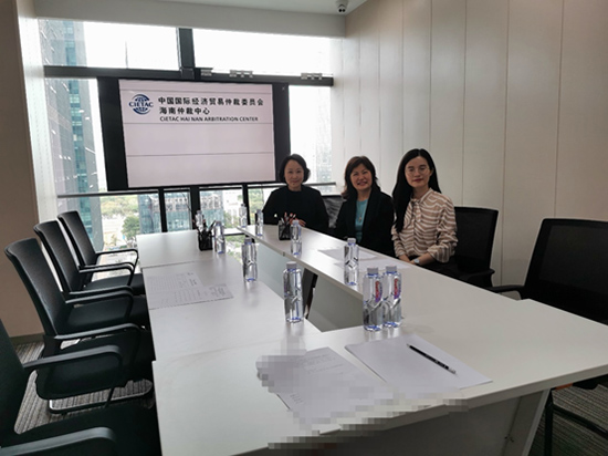 (自左向右:貿(mào)仲海南仲裁中心秘書長王文英、獨任仲裁員岳潔、案件經(jīng)辦人余婷)
