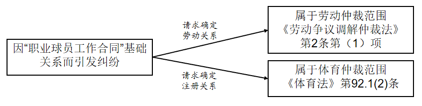 職業(yè)球員是俱樂(lè)部勞動(dòng)者,但是從事特殊勞動(dòng)勞動(dòng)者,因此職業(yè)球員不僅具有勞動(dòng)者身份,也是球員的特殊勞動(dòng)者身份。因此,依據(jù)球員訴請(qǐng)的內(nèi)容,來(lái)判斷管轄:如請(qǐng)求確認(rèn)勞動(dòng)者身份,即勞動(dòng)關(guān)系確認(rèn)(勞動(dòng)爭(zhēng)議調(diào)解仲裁法第二條第(1)項(xiàng)“因確認(rèn)勞動(dòng)關(guān)系發(fā)生的爭(zhēng)議”),屬于勞動(dòng)仲裁范圍;如請(qǐng)求確認(rèn)球員身份(特殊勞動(dòng)者),即要求明確球員的注冊(cè)身份問(wèn)題(體育法第九十二條第1款第(2)項(xiàng)“因運(yùn)動(dòng)員注冊(cè)、交流發(fā)生的糾紛”),則屬于體育仲裁范圍,如下圖。