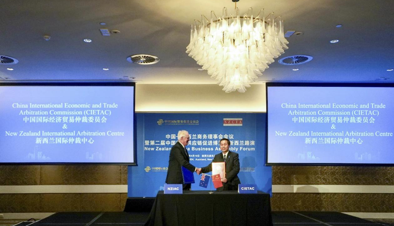 2024年4月19日,在中國貿(mào)促會(huì)會(huì)長任鴻斌率中國企業(yè)家代表團(tuán)訪問新西蘭期間,中國國際經(jīng)濟(jì)貿(mào)易仲裁委員會(huì)(以下簡稱“貿(mào)仲”)副主任兼秘書長王承杰與新西蘭國際仲裁中心主任約翰·格林(John Green),在奧克蘭于中國—新西蘭商務(wù)理事會(huì)會(huì)議上簽署了合作協(xié)議。中國貿(mào)促會(huì)會(huì)長任鴻斌、新西蘭中國貿(mào)易協(xié)會(huì)主席約翰·考克倫(John Cochrane)、中國駐新西蘭大使王小龍、駐奧克蘭總領(lǐng)事陳世杰等出席簽約儀式。