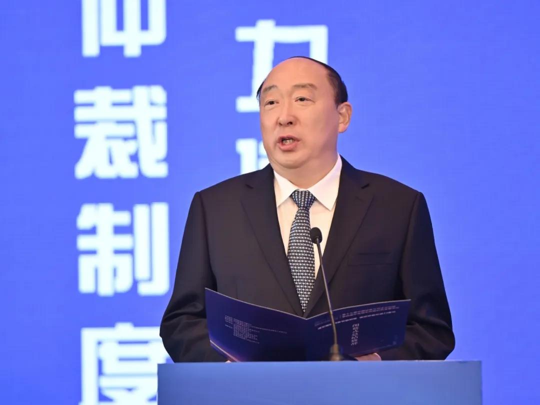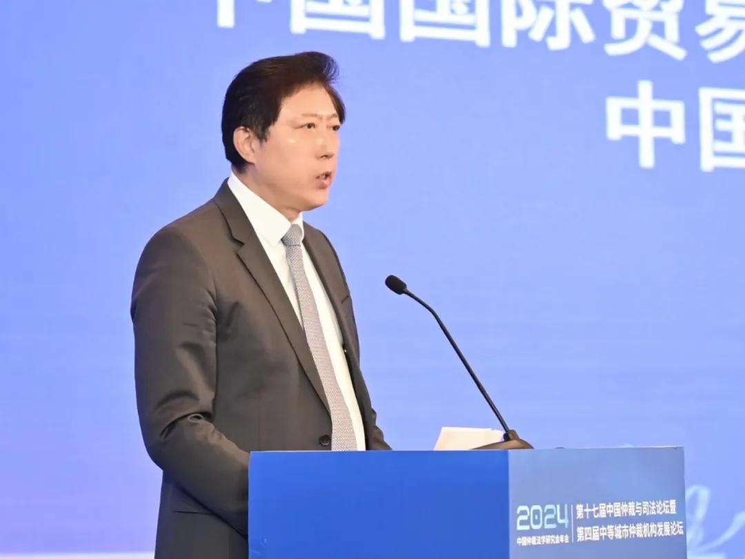 (中國(guó)國(guó)際貿(mào)易促進(jìn)委員會(huì)黨組成員、副會(huì)長(zhǎng)、中國(guó)仲裁法學(xué)研究會(huì)會(huì)長(zhǎng)于健龍作開幕致辭)