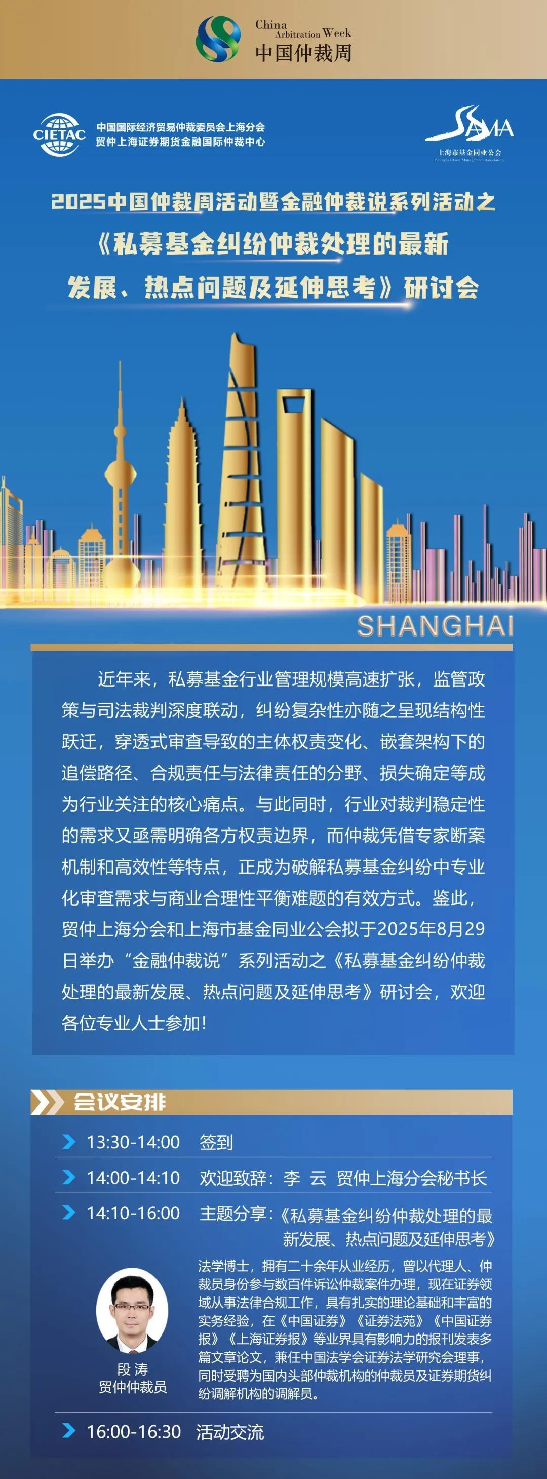 由中國國際經(jīng)濟(jì)貿(mào)易仲裁委員會(huì)等單位聯(lián)合發(fā)起的2025年第十三屆中國仲裁周即將拉開帷幕。為進(jìn)一步提升中國仲裁周活動(dòng)平臺(tái)專業(yè)價(jià)值與全球影響力,貿(mào)仲上海分會(huì)和上海市基金同業(yè)公會(huì)將于2025年8月29日舉辦2025中國仲裁周活動(dòng)暨金融仲裁說系列活動(dòng)之《私募基金糾紛仲裁處理的最新發(fā)展、熱點(diǎn)問題及延伸思考》研討會(huì),期待各位嘉賓報(bào)名參與。