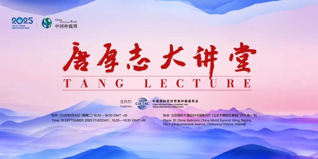 The 9th TANG Lecture organized by China International Economic and Trade Arbitration Commission (CIETAC) will be held at 16:30 on 16th September 2025 at the B1 China Ballroom, China World Summit Wing, Beijing (No.1 Jianguomenwai Avenue, Chaoyang District, Beijing).