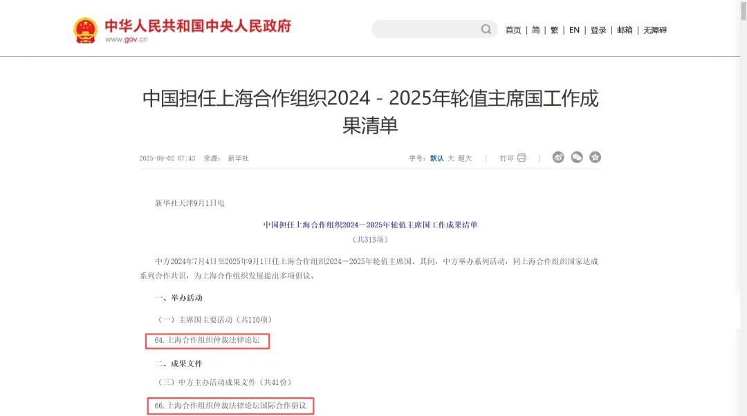 9月1日,上海合作組織成員國(guó)元首理事會(huì)第二十五次會(huì)議在天津順利召開(kāi)。外交部發(fā)布《中國(guó)擔(dān)任上海合作組織2024-2025年輪值主席國(guó)工作成果清單》(以下簡(jiǎn)稱《成果清單》),中國(guó)國(guó)際經(jīng)濟(jì)貿(mào)易仲裁委員會(huì)(以下簡(jiǎn)稱貿(mào)仲)兩項(xiàng)成果收錄其中。由貿(mào)仲主辦的“上合組織仲裁法律論壇”,被列入《成果清單》“主席國(guó)主要活動(dòng)”(第64項(xiàng))。論壇所發(fā)布的《上合組織仲裁法律論壇國(guó)際合作倡議》被列入《成果清單》“中方主辦活動(dòng)成果文件”(第66項(xiàng))。
