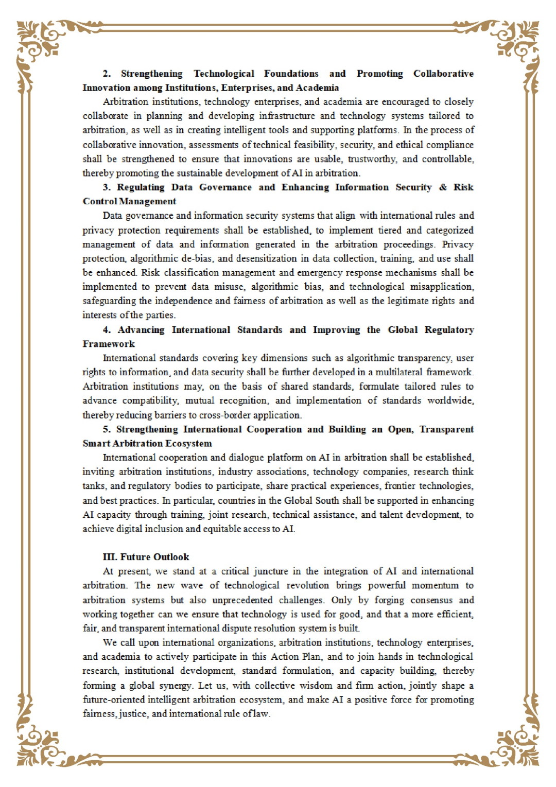 有鑒于此,貿(mào)仲于本次論壇正式形成并發(fā)布《行動計(jì)劃》,系統(tǒng)闡述了人工智能與國際仲裁融合發(fā)展的方向與路徑?!缎袆佑?jì)劃》明確提出四大合作目標(biāo):一是包容共享、彌合鴻溝,推動全球仲裁機(jī)構(gòu)間技術(shù)交流與能力建設(shè);二是尊重權(quán)利、保障程序,確保仲裁程序的獨(dú)立性與正當(dāng)性;三是提升透明、促進(jìn)公正,推動人工智能應(yīng)用適度披露;四是協(xié)同治理、構(gòu)建標(biāo)準(zhǔn),倡導(dǎo)制定國際共識與規(guī)則。同時,《行動計(jì)劃》提出五方面合作框架:一是拓展應(yīng)用場景,探索“人工智能+仲裁”的融合模式;二是夯實(shí)技術(shù)基礎(chǔ),推動機(jī)構(gòu)、企業(yè)與學(xué)術(shù)界協(xié)同創(chuàng)新;三是規(guī)范數(shù)據(jù)治理,強(qiáng)化信息安全與風(fēng)險防控;四是推進(jìn)國際標(biāo)準(zhǔn)制定,完善全球規(guī)則體系;五是加強(qiáng)國際交流合作,共建開放透明的智能仲裁生態(tài),特別關(guān)注全球南方國家的能力提升與數(shù)字普惠?!缎袆佑?jì)劃》指出,人工智能與國際仲裁的融合發(fā)展正處在重要關(guān)口。唯有凝聚共識、攜手合作,方能確保技術(shù)向善而行,推動建立更加高效、公正、透明的國際爭議解決體系。