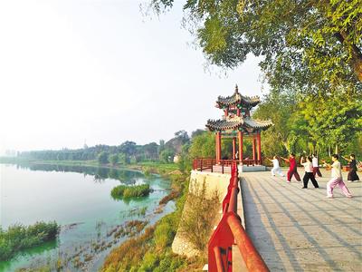 清晨,在故城縣大運河國家文化公園,人們迎著朝陽鍛煉身體。河北日報記者 焦 磊攝