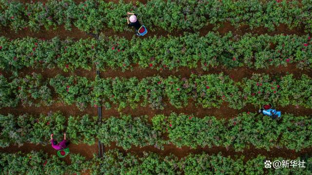 2021年9月9日,小河邊村小組村民在采摘鮮食玫瑰(無人機照片)。新華社記者 胡超攝