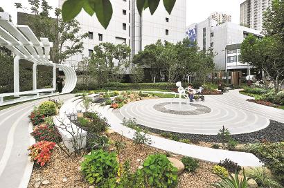 在位于靜安區(qū)膠州路安遠(yuǎn)路交叉口的“音花園”,無(wú)障礙步道的鋪設(shè)給腿腳不便,使用嬰兒車、輪椅的市民帶去舒適與便利。視覺(jué)中國(guó)供圖