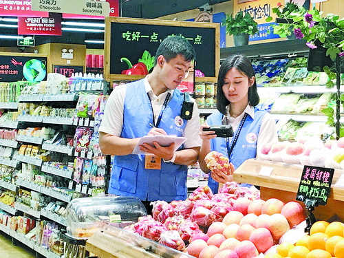 檢驗人員對商超銷售的果蔬進行抽檢。