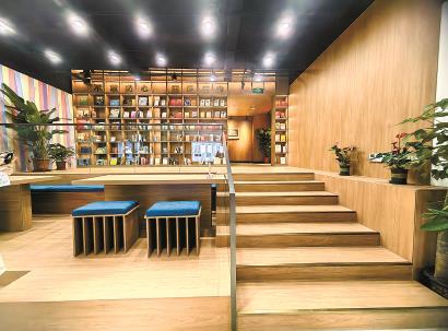 一樓的核心區(qū)域被命名為“紫竹客廳”,一眼望去,擺放著各類組合式桌椅,有居民三三兩兩地坐下閑聊。整排窗的位置被設計成長條吧臺,可供年輕人獨坐休閑。而大屏幕底下的方塊格子其實“藏”著一個個小方凳,可隨時拿出來使用。