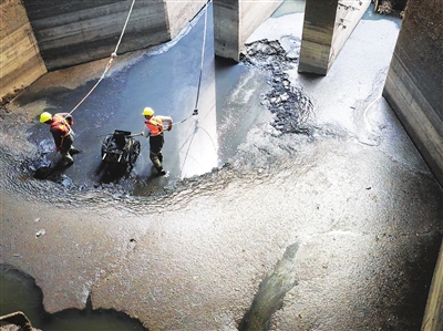 相對(duì)于道路上的管道清淤,泵房內(nèi)的清淤工作要難上許多:工作人員需要下到近10米深、黑暗潮濕的空間中進(jìn)行人工清淤。