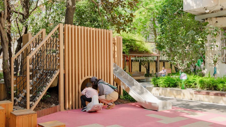 最終,設(shè)計(jì)師圍著一棵廣玉蘭和一棵小桂花樹打造了“兒童游戲區(qū)”,設(shè)計(jì)了小小的樹屋滑梯,提供爬網(wǎng)與木樁小山的雙重攀爬選擇。木樁小山背后設(shè)計(jì)了一個(gè)超大的黑板墻。“意想不到的‘好用’。居委干部告訴我們,孩子們?cè)诤诎迳喜恢皇峭客慨嫯?,還能寫作業(yè)、算數(shù)學(xué)題?!?/p>
