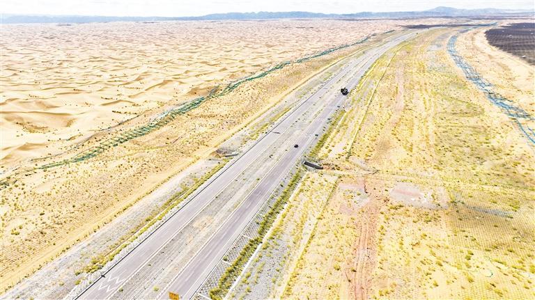 寧夏首條沙漠公路烏瑪高速公路青銅峽至中衛(wèi)段,全長(zhǎng)122.99公里,其中18公里穿越騰格里沙漠腹地。