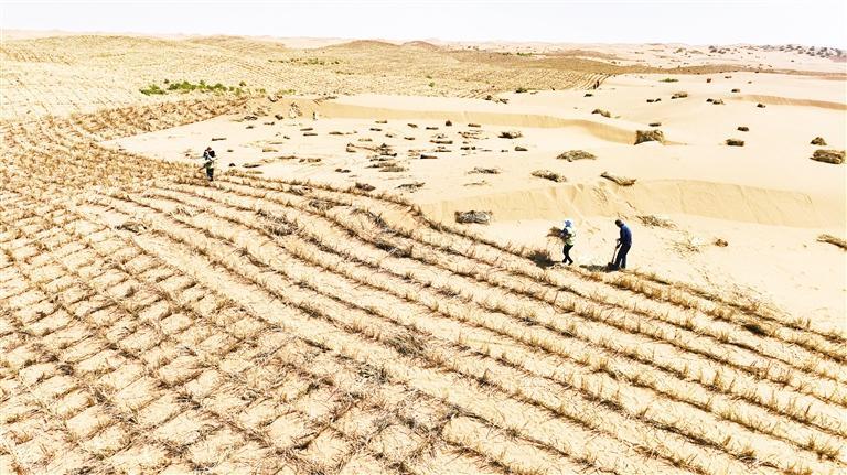 工人在騰格里沙漠扎制被譽(yù)為“治沙魔方”的麥草方格。