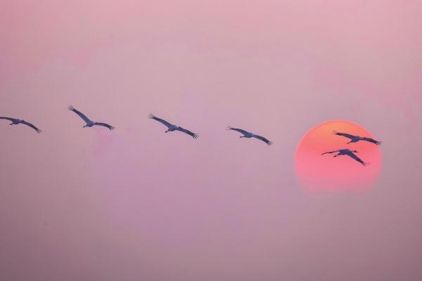 1月8日,臨湘市黃蓋湖,國家一級保護動物白鶴穿日而過。白鶴全球數(shù)量6000多只,繁殖于西伯利亞,長江中游是其最重要的越冬地。
