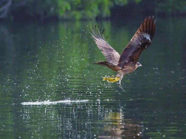 1月27日,長沙市雨花區(qū)跳馬鎮(zhèn),國家二級保護動物黑鳶在空中盤旋,發(fā)現(xiàn)魚浮出水面,迅速俯沖將其捕獲,然后帶到安全的地方享用。