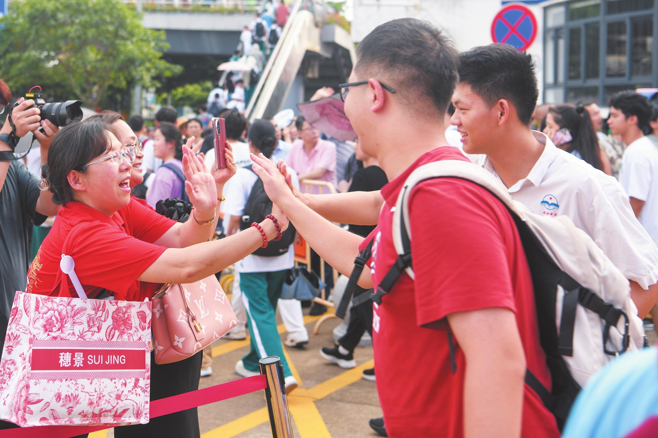 6月8日,在海南華僑中學(xué)高中部考點(diǎn)外,老師和走出考場的考生擊掌。記者 楊鶴 攝
