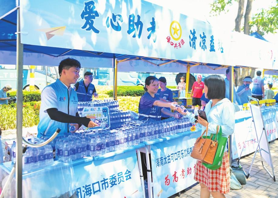 6月8日,在??诤8蹖W(xué)校考點(diǎn)外,青年志愿者為考生家長送上飲用水。記者 石中華攝