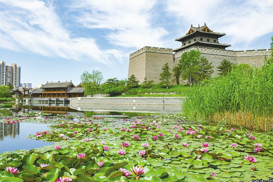 6月7日,在大同城墻帶狀公園東南角,護城河內的大片睡蓮悄然盛開,與岸邊的綠樹、古城墻構成一幅動靜相宜的美麗畫卷。戎禹仁 攝