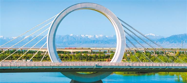 6月10日,甘肅省張掖市甘州區(qū)皓月大橋與祁連山脈和鐵路列車(chē)構(gòu)成一幅和美畫(huà)卷,吸引游客前來(lái)打卡。楊永偉攝(中經(jīng)視覺(jué))