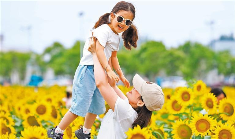 6月7日,游客在安徽省淮北市渠溝鎮(zhèn)張樓村油葵種植基地賞花游玩。李鑫攝(中經(jīng)視覺(jué))