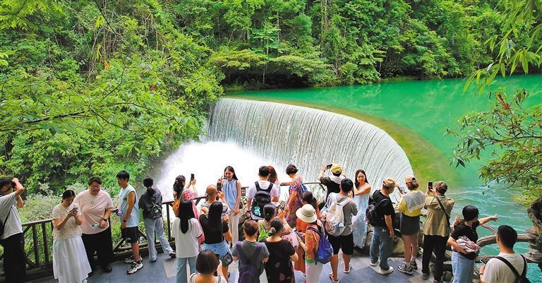 6月10日,貴州省荔波縣小七孔景區(qū)碧波蕩漾,游客在臥龍?zhí)镀俨记芭恼樟裟?。郭興成攝(中經(jīng)視覺(jué))