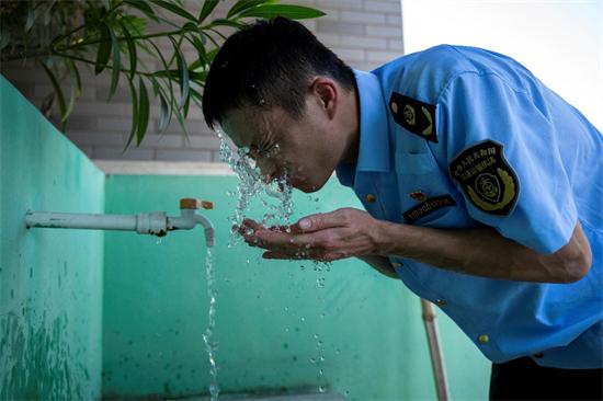 撤回休息點,張可贊接起一抔水,潑到臉上,帶來一陣冰涼。回到室內(nèi),冷氣吹過身體,濕透的制服變得硬挺,張可贊和隊友拿起一瓶水,一飲而盡。