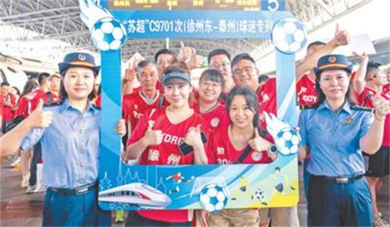 江蘇省城市足球聯(lián)賽(“蘇超”)期間,多部門提供“球迷專列”等便民服務(wù)。城市用精細(xì)服務(wù)傳遞文明理念,市民用高素質(zhì)行為反哺城市形象。圖為球迷乘坐C9701次專列到達(dá)泰州站后留影。湯德宏攝(影像中國)