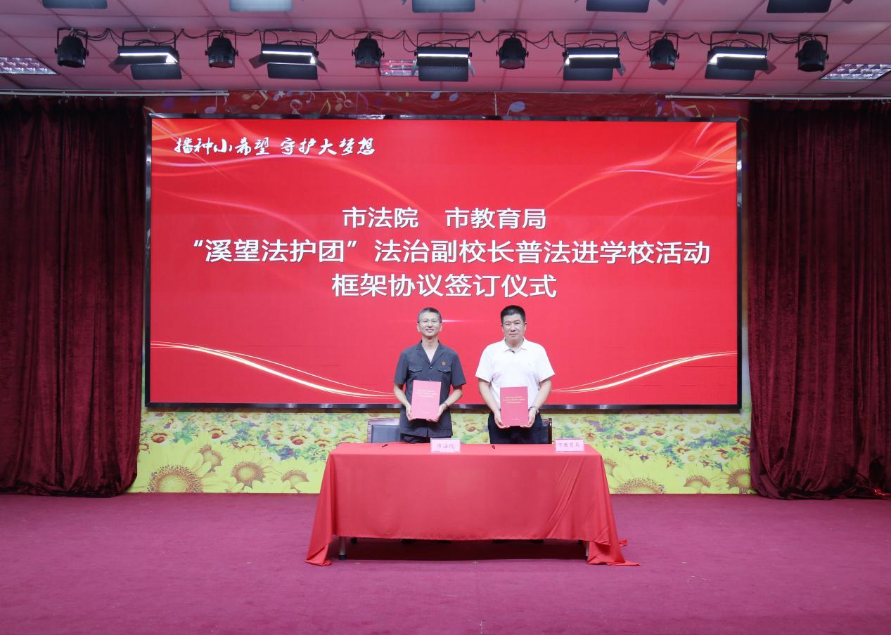 慈溪市法院黨組副書記、副院長朱紅暉,慈溪教育局黨委委員、副局長徐國慶共同簽訂框架協(xié)議。