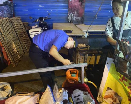 執(zhí)法人員來到港道路、中官路等夜市集中經(jīng)營點,建立“一攤一檔”安全臺賬,對使用燃氣的商戶進行全覆蓋檢查。過程中,執(zhí)法人員重點對夜市區(qū)域內(nèi)液化氣瓶是否具有年檢標識、液壓閥的老舊程度、輸氣膠管的老化程度、滅火器是否合理配備和擺放等情況進行詳細檢查。