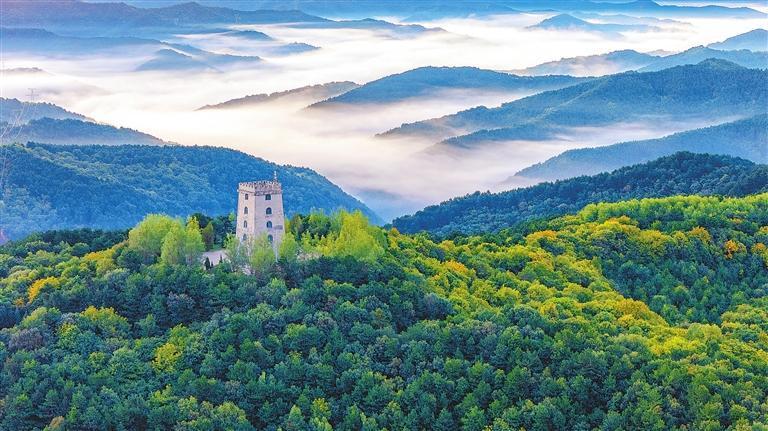 金秋時節(jié),晨曦中的正寧縣中灣林場調(diào)令關(guān)森林公園美如畫卷。王啟寧 攝