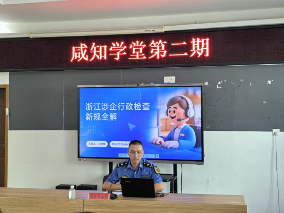在隨后舉辦的“咸知學(xué)堂”第二期課程中,咸祥鎮(zhèn)綜合行政執(zhí)法隊(duì)二中隊(duì)中隊(duì)長(zhǎng)、公職律師王金華以《浙江涉企行政檢查新規(guī)全解》為題,結(jié)合省、市最新政策精神,為執(zhí)法人員與監(jiān)督員帶來(lái)一場(chǎng)“雙向賦能”的專題培訓(xùn)。他詳細(xì)解讀了執(zhí)法主體“四嚴(yán)禁”、執(zhí)法檢查“五個(gè)嚴(yán)禁、八個(gè)不得”等內(nèi)容,通過(guò)真實(shí)案例展示“怎樣才算規(guī)范檢查”“企業(yè)如何識(shí)別違規(guī)行為”,并現(xiàn)場(chǎng)演示掃碼檢查、數(shù)據(jù)實(shí)時(shí)上傳等數(shù)字化流程,要求執(zhí)法人員做到每一次執(zhí)法全程留痕、可追溯可評(píng)價(jià)。