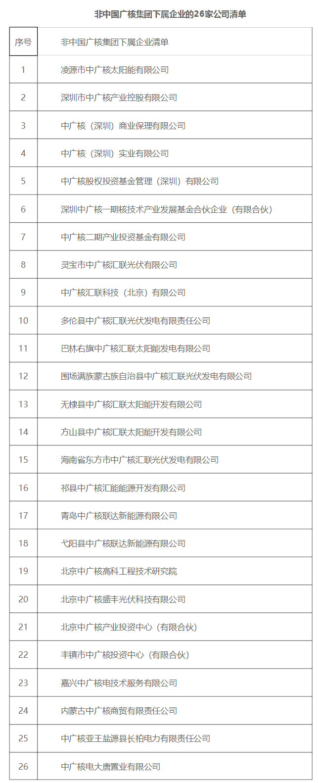 4月份,中廣核發(fā)布公告稱:凌源市中廣核太陽能有限公司、深圳市中廣核產(chǎn)業(yè)控股有限公司、嘉興中廣核電技術(shù)服務(wù)有限公司等26家公司在企業(yè)名稱中使用“中廣核”字樣。鑒于該26家公司并非我集團(tuán)下屬企業(yè),鄭重澄清并嚴(yán)正聲明,中國廣核集團(tuán)未擁有下述26家公司的任何資產(chǎn)或股權(quán),亦無隸屬或管理關(guān)系,并未授權(quán)下述公司使用“中廣核”商標(biāo)和字號,若因下述公司的經(jīng)營行為導(dǎo)致法律、勞務(wù)糾紛或其他相關(guān)責(zé)任,均與我集團(tuán)無關(guān)。