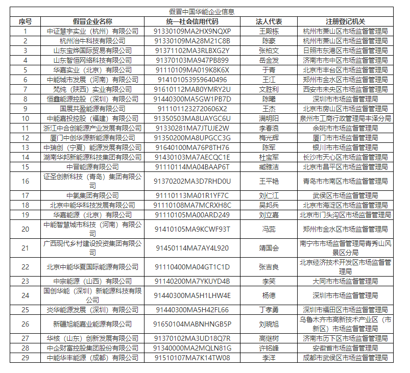 中國華能稱,發(fā)現(xiàn)不法分子通過偽造中國華能集團(tuán)有限公司(以下簡稱“中國華能”)所屬企業(yè)證照和印章,在北京、深圳、杭州、鄭州、西安等地工商系統(tǒng)中將29家企業(yè)的股東分別登記為華能(大連)能源熱力有限責(zé)任公司、華能綜合產(chǎn)業(yè)有限公司、華能海外企業(yè)管理有限公司、華能新能源股份有限公司以及天津華能楊柳青熱電實(shí)業(yè)有限公司。