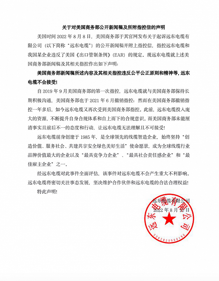 8月11日消息,遠(yuǎn)東電纜有限公司發(fā)布關(guān)于對(duì)美國(guó)商務(wù)部公開新聞稿及所附指控信的聲明稱,美國(guó)商務(wù)部新聞稿所述內(nèi)容及其相關(guān)指控違反公平公正原則和精神等,遠(yuǎn)東電纜不會(huì)接受。