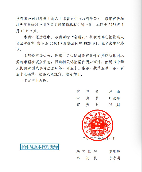 如4月1日,江蘇南京中院基于“金銀花”關(guān)聯(lián)案件已被最高法提審,決定中止審理上訴人南京三盾藥業(yè)有限公司、青島海氏海諾英諾威消毒科技有限公司與被上訴人上海碧麗化妝品有限公司案?!白罡呷嗣穹ㄔ簩?duì)提審案件的處理結(jié)果對(duì)本案的審理有實(shí)質(zhì)影響,目前相關(guān)訴訟案件尚未審結(jié),依法裁定本案中止訴訟?!辈枚〞Q。