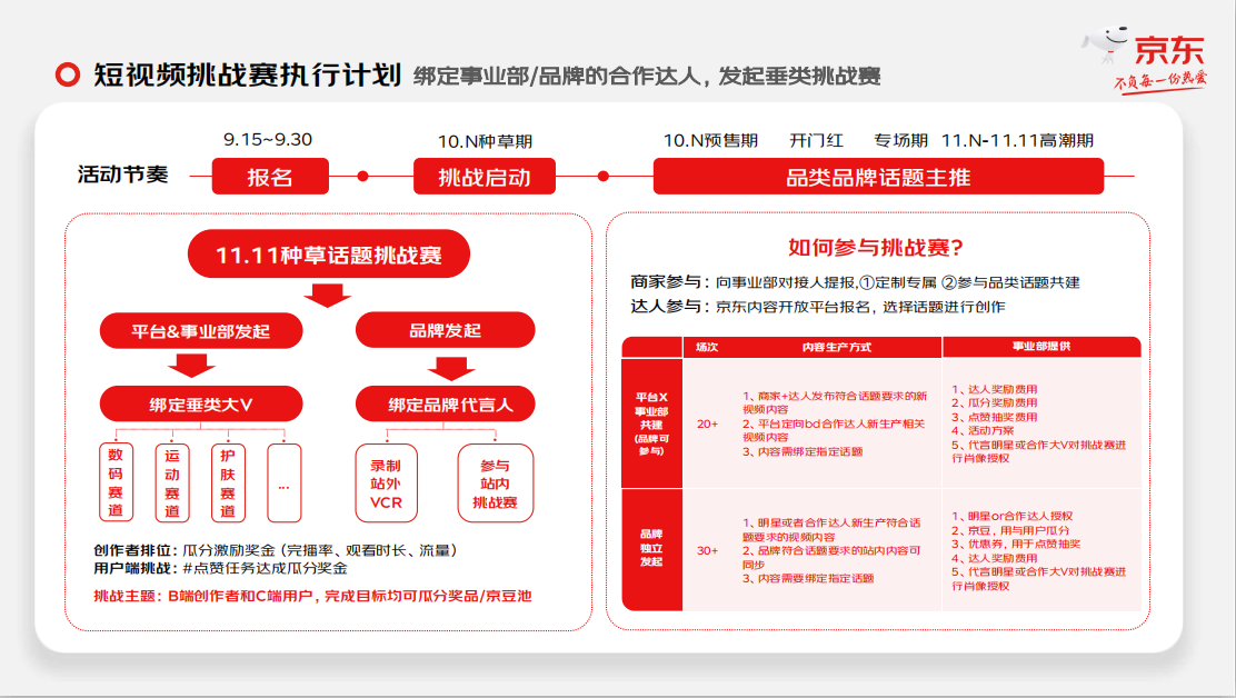 今年京東11.11期間,京東內(nèi)容業(yè)務(wù)將持續(xù)加速深耕短視頻營銷陣地,在短視頻呈現(xiàn)、商家端、消費(fèi)端玩法和創(chuàng)作者玩法三個(gè)方面進(jìn)行升級,以“話題挑戰(zhàn)賽”玩法喚醒用戶與品牌間的情感共鳴。