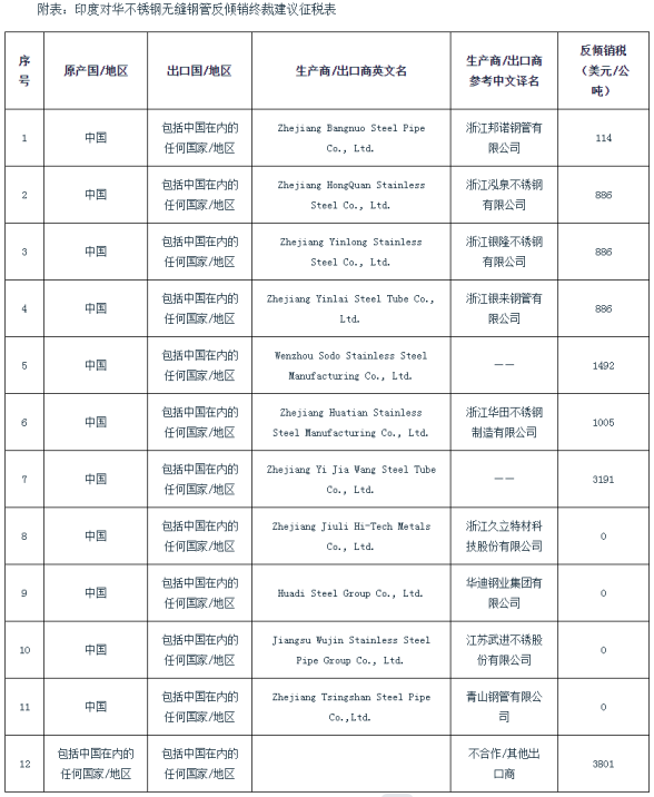 2022年9月23日,印度商工部發(fā)布公告,對(duì)原產(chǎn)于或進(jìn)口自中國(guó)的直徑小于等于6英寸的不銹鋼無縫鋼管(Stainless-steel Seamless Tubes & Pipes)作出反傾銷終裁,建議對(duì)中國(guó)的涉案產(chǎn)品征收為期5年的反傾銷稅,稅額為0~3801美元/公噸,征稅詳情見附表(印度對(duì)華不銹鋼無縫鋼管反傾銷終裁建議征稅表)。涉案產(chǎn)品為無論是采用熱擠壓工藝或熱穿孔工藝制造,無論是作為熱加工管或冷加工管售賣,包括缺陷品、非打印品或二級(jí)品在內(nèi)的、公稱直徑不超過6英寸或與其相當(dāng)?shù)钠渌?jì)量單位的不銹鋼無縫鋼管,涉及印度海關(guān)編碼7304項(xiàng)下的產(chǎn)品。