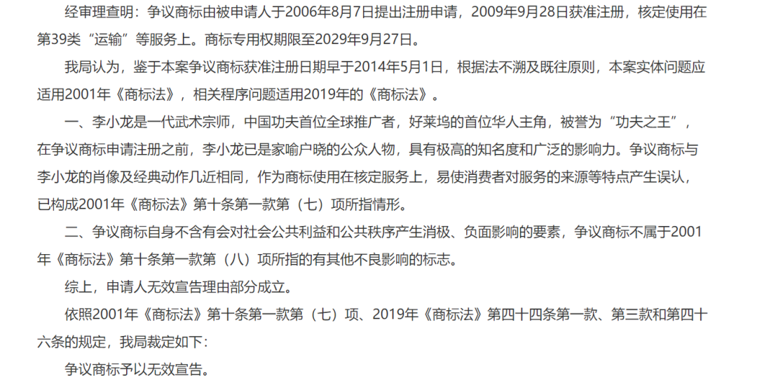 國家知識產(chǎn)權(quán)局審理認為,李小龍是一代武術(shù)宗師,中國功夫首位全球推廣者,好萊塢的首位華人主角,被譽為“功夫之王”,在爭議商標(biāo)申請注冊之前,李小龍已是家喻戶曉的公眾人物,具有極高的知名度和廣泛的影響力。爭議商標(biāo)與李小龍的肖像及經(jīng)典動作幾近相同,作為商標(biāo)使用在核定服務(wù)上,易使消費者對服務(wù)的來源等特點產(chǎn)生誤認,已構(gòu)成2001年《商標(biāo)法》第十條第一款第(七)項所指情形(即夸大宣傳并帶有欺騙性的標(biāo)志不得作為商標(biāo)使用)。
