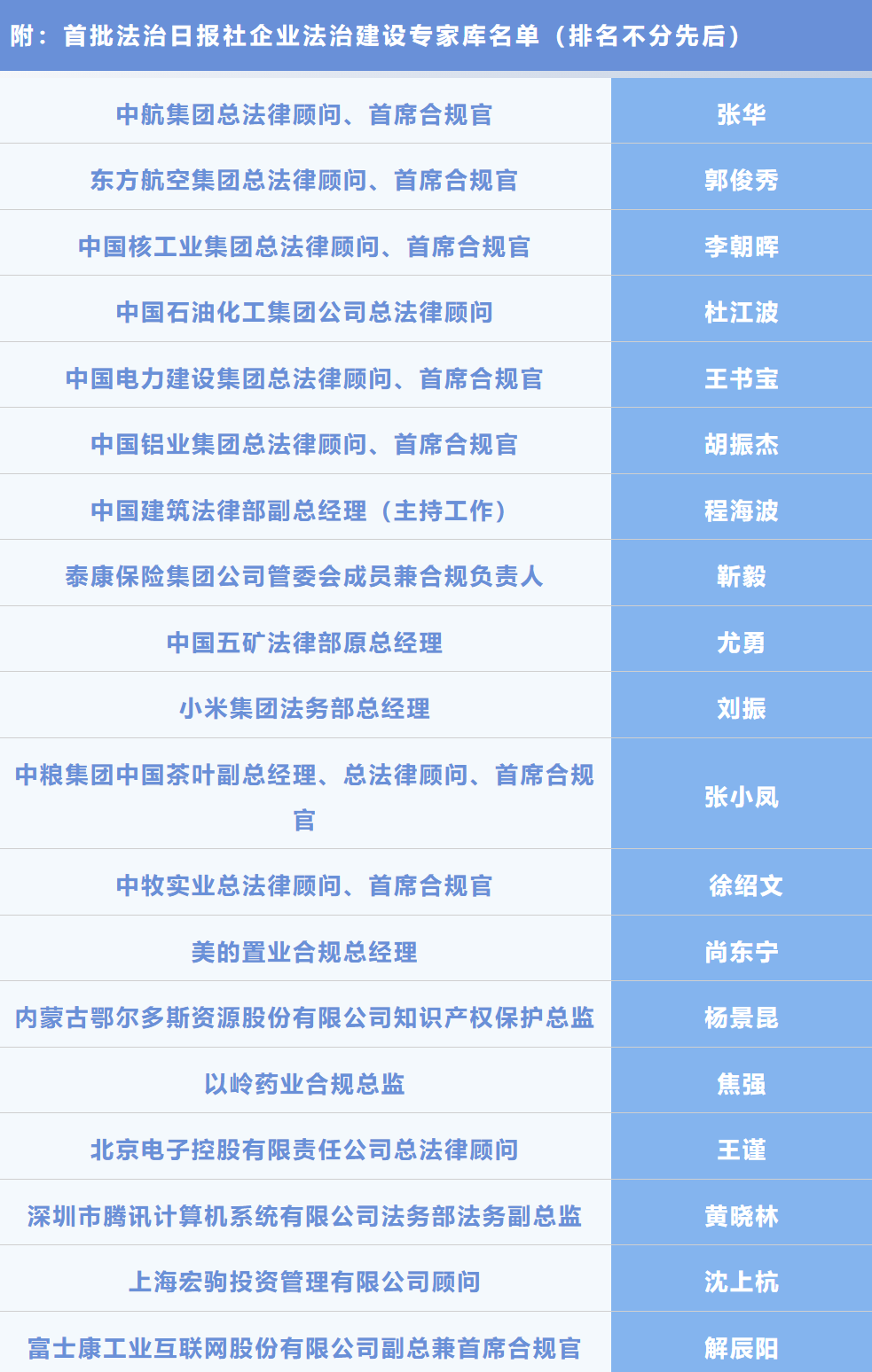 這是法治日報社聘選的首批企業(yè)法治建設專家,共19位資深企業(yè)法務專家獲聘,均為來自知名企業(yè)的總法律顧問、首席合規(guī)官、法律合規(guī)部門負責人或致力于推動企業(yè)法治建設的專業(yè)人士。