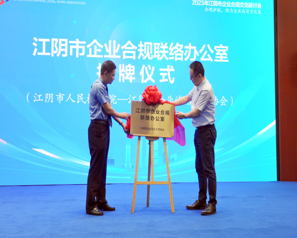 會上,江陰市人民檢察院四級高級檢察官陳衛(wèi)東、江陰市企業(yè)法治工作協(xié)會會長蔡磊共同為“江陰市企業(yè)合規(guī)聯(lián)絡(luò)辦公室”揭牌。隨后,陳衛(wèi)東介紹了江陰市人民檢察院開展企業(yè)合規(guī)工作的總體情況,包括檢察環(huán)節(jié)合規(guī)的定位、相關(guān)經(jīng)驗做法以及取得的主要成效。