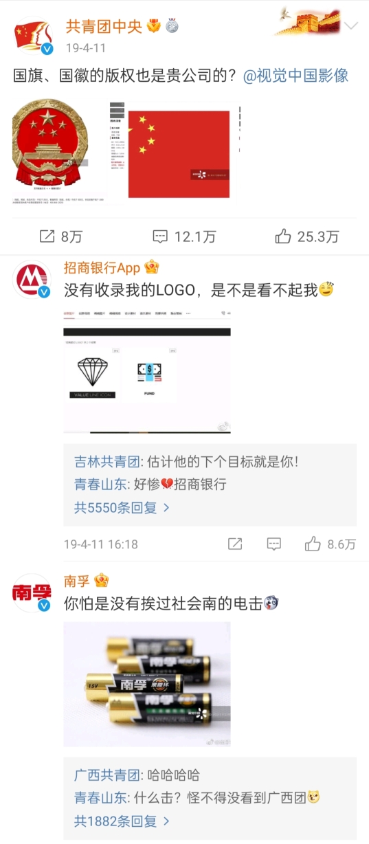 2019年4月11日,“共青團中央”官微點名視覺中國并質疑:“國旗、國徽的版權也是貴公司的?”隨后,一眾藍V排隊評論自家LOGO也被視覺中國收入囊中,甚至連歷史書上的人物圖也被視覺中國明碼標價,成為其牟利之物。