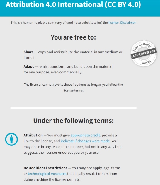 知識共享署名4.0國際許可協(xié)議,允許使用者用于商業(yè)用途,但不得應用法律條款或技術措施來合法限制他人執(zhí)行許可證允許的任何操作。 截圖自CC官網。