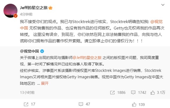 “我不接受你們的觀點。我已與Stocktrek進行核實,Stocktrek明確告知我: @視覺中國 無權銷售我的作品,也沒有我作品的任何版權。Getty也無權將我的作品再次轉授。這里沒有誤會,到現(xiàn)在,你們依然在網上非法銷售我的作品,向我與他人謊稱你們擁有作品的著作權并索賠。請立即停止你們的侵權行為!”