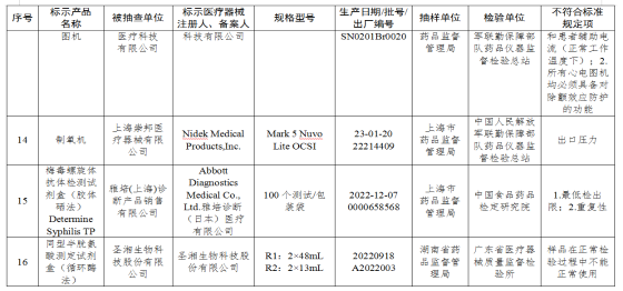 據(jù)國家藥監(jiān)局網(wǎng)站消息,為加強(qiáng)醫(yī)療器械監(jiān)督管理,保障醫(yī)療器械產(chǎn)品質(zhì)量安全有效,國家藥監(jiān)局組織對呼吸道用吸引導(dǎo)管(吸痰管)、生物反饋治療設(shè)備等11個品種進(jìn)行產(chǎn)品質(zhì)量監(jiān)督抽檢,發(fā)現(xiàn)16批(臺)產(chǎn)品不符合標(biāo)準(zhǔn)規(guī)定。