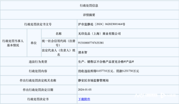 近日,南都·灣財社記者從上海市市場監(jiān)督管理局獲悉,無印良品(上海)商業(yè)有限公司因銷售以不合格產(chǎn)品冒充合格產(chǎn)品,違反產(chǎn)品質(zhì)量法相關(guān)規(guī)定。被靜安區(qū)市場監(jiān)督管理局罰款2517.5元,沒收違法所得377.1元。