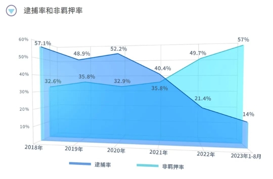 拘留和逮捕等羈押性強制措施是為了保障刑事訴訟順利進(jìn)行,適用于嚴(yán)重犯罪或者有社會危險性,有再犯、串供等風(fēng)險的案件。輕罪案件因行為本身情節(jié)較輕,社會危害性相對較小,一些抽象危險犯,如危險駕駛罪等,甚至沒有造成實害后果。另外,隨著偵查水平和科技程度的與日俱增,刑事案件的定案對口供的依賴程度明顯降低,尤其法定犯的犯罪性質(zhì)決定了證據(jù)上以客觀證據(jù)為主,辦案過程中對羈押的需求減弱。因此,針對輕罪案件采取羈押措施更為審慎,逮捕強制措施的適用比例不斷降低,取保候?qū)彽确橇b押強制措施的適用比例大幅上升。2018年海淀區(qū)檢察院受理的輕罪案件中,采取逮捕強制措施的為57.1%,采取取保候?qū)?、監(jiān)視居住等非羈押強制措施的為32.6%;2019年,二者占比分別為48.9%、35.8%;2022年,二者比例則為21.4%、49.7%;2023年1-8月,采取逮捕強制措施的比例下降至14%,非羈押強制措施的適用率則上升至57%。