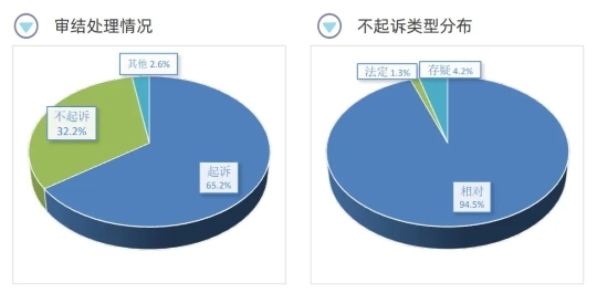 輕罪案件社會危害性較小、罪責(zé)輕,犯罪嫌疑人認(rèn)罪悔過可能性較大。檢察機關(guān)在辦理輕罪案件過程中,更加注重貫徹寬嚴(yán)相濟(jì)刑事政策精神,全面落實認(rèn)罪認(rèn)罰從寬制度,輕罪案件處理趨于寬緩。從認(rèn)罪認(rèn)罰從寬制度適用情況看,2018年以來,輕罪案件認(rèn)罪認(rèn)罰從寬制度的適用率達(dá) 97.4%;從輕罪案件的審結(jié)處理情況來看,2018年至2023年8月,經(jīng)審查作出起訴決定的11852人,起訴率為65.2%;作出不起訴決定5848人,不起訴率為32.2%,其中94.5%為相對不起訴。
