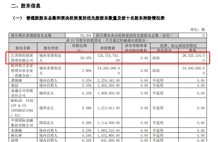 根據(jù)宏達(dá)新材2024年第一季度報告,江蘇偉倫持有12573.57萬股宏達(dá)新材股票,持股比例29.07%,其中2832.51萬股處于被凍結(jié)狀態(tài)。另據(jù)天眼查顯示,江蘇偉倫成立于2007年,注冊資本8696萬元,公司實(shí)際控制人為朱恩偉,法定代表人為吳寶歧。