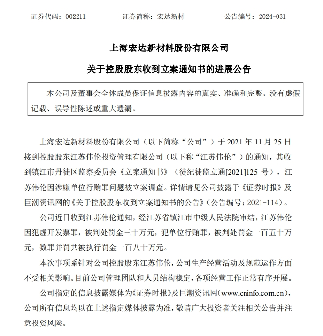 據(jù)公告披露,宏達(dá)新材于2021年11月25日接到控股股東江蘇偉倫的通知,其收到鎮(zhèn)江市丹徒區(qū)監(jiān)察委員會《立案通知書》(徒紀(jì)徒監(jiān)立通[2021]125號),江蘇偉倫因涉嫌單位行賄罪問題被立案調(diào)查。