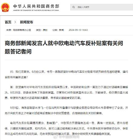 商務(wù)部新聞發(fā)言人就中歐電動(dòng)汽車反補(bǔ)貼案有關(guān)問(wèn)題答記者問(wèn)。